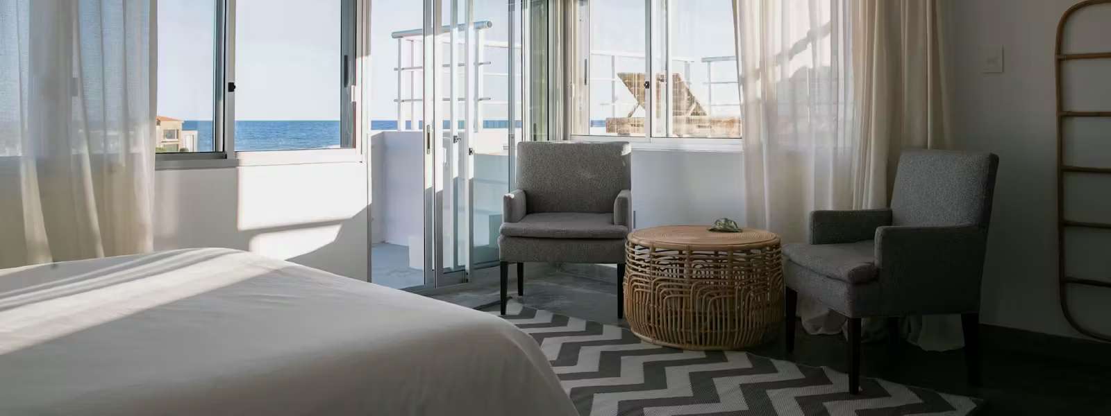 Deje que el mar sea su telón de fondo en nuestras habitaciones Superior VM. Disfrute del sonido de las olas y la suave brisa marina mientras se relaja en un ambiente de pura tranquilidad y sofisticación.